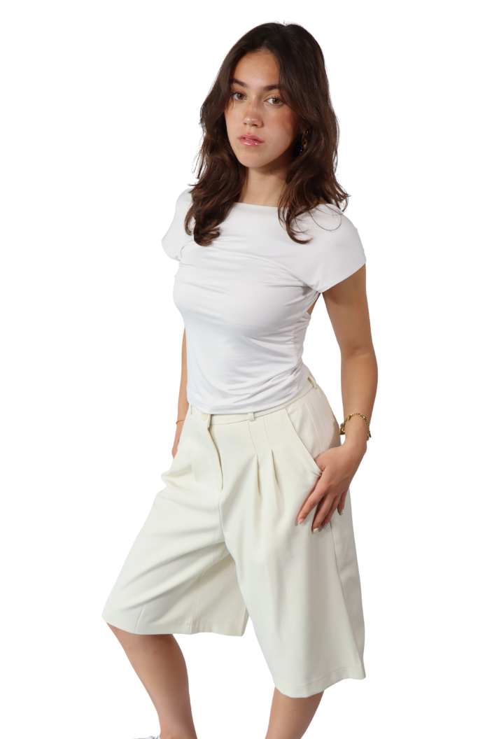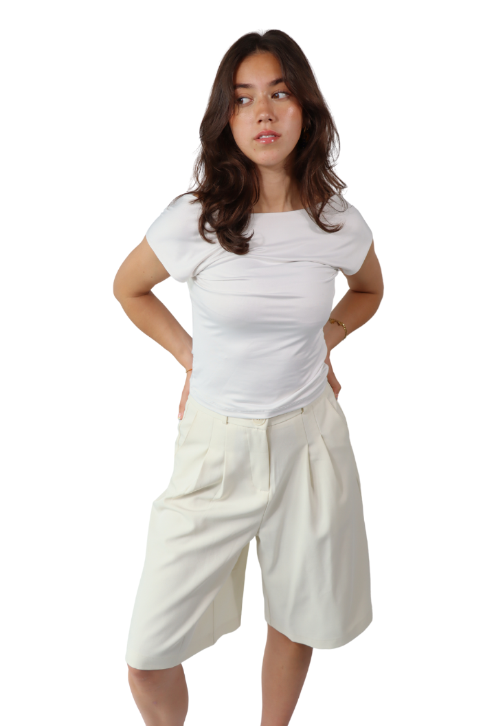 Een moderne essential die perfect aansluit bij de trends van nu. Deze crème bermuda is veelzijdig en stijlvol, een item dat je eindeloos kunt combineren. Voor een krachtige en toch zachte look draag je hem met de Crème Mouwloze Wikkel Gilet als set binnen de Soft Lines collectie.